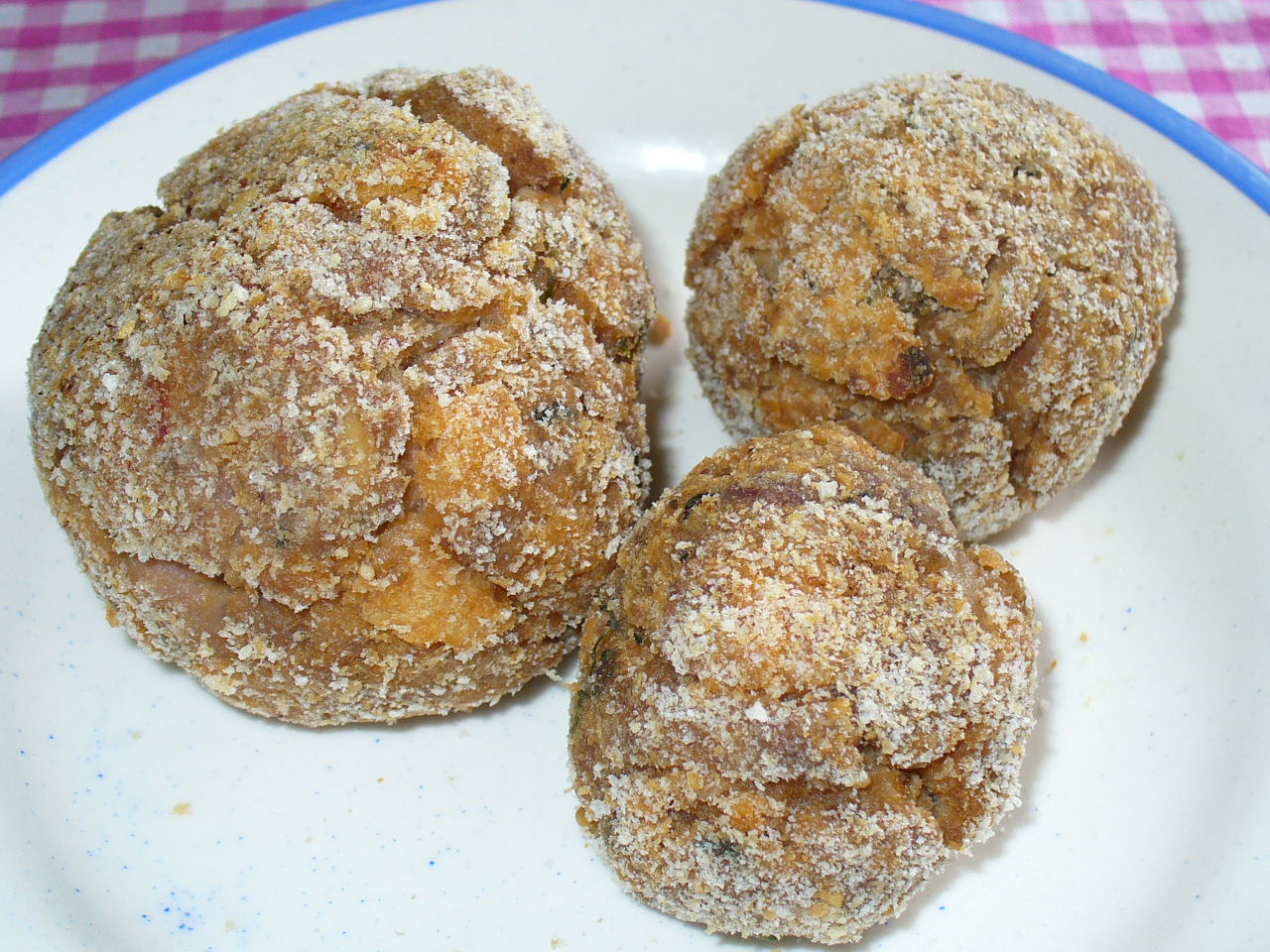 Facciamo delle palline come desideriamo,io le ho fatte piccole,medie e grosse;a parte mettiamo altro pane grattugiato in un piatto fondo perchè,una volta formate le polpette,dobbiamo passarle dentro per creare la loro “crosta”.
