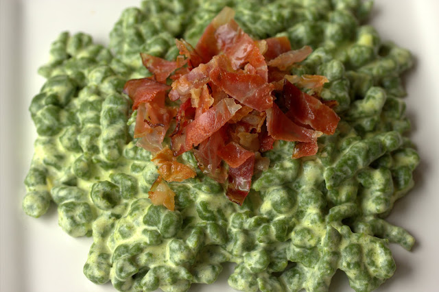 Gli spätzle che cadranno nell’acqua bollente , saranno cotti quando riaffioreranno in superficie ; a quel punto prendeteli con una schiumarola ,scolateli bene e trasferiteli nella padella per farli saltare per pochi secondi nel condimento di panna e speck. Sevite gli spätzle immediatamente.