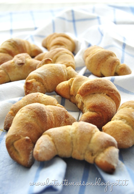 Ora staccate il triangolo dall’insieme, con una mano afferrate la base e con l’altra tendete leggermente la punta con delicatezza, ed allungatelo di qualche centimetro. Riadagiatelo sulla spianatoia e arrotolate partendo dalla base fino alla punta stringendo ai lati per non far uscire il miele e dando a loro la forma del cornetto (volendo così possono essere congelati).