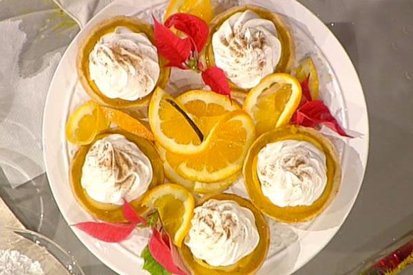 Impastiamo la frolla, amalgamando tutti gli ingredienti, quindi lasciamola riposare in frigorifero per 40 minuti circa. Stendiamo la frolla e rivestiamo gli stampini imburrati. Farciamo i gusci di frolla con la marmellata di arance e inforniamo per 25 minuti circa a 180°. Sopra, disponiamo le arance caramellate e fredde. Completiamo con dei ciuffi di meringa, che abbiamo ottenuto montando gli albumi con lo zucchero a velo. Spolveriamo di cannella.