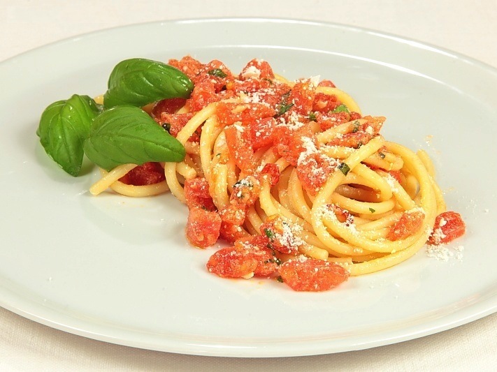 Scolatela ed amalgamatela al condimento di pomodori in infusione preparata precedentemente.