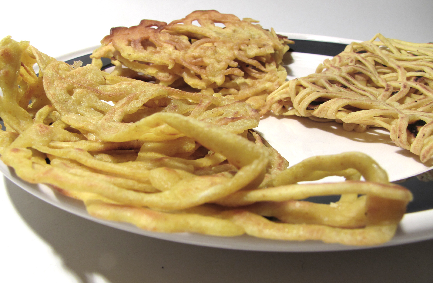 Mescolare con un cucchiaio di legno tutti gli ingredienti fino ad ottenere un impasto omogeneo e piuttosto morbido; metterlo in una sac- a poche o in una siringa per dolci quindi versarlo in una padella con 4 cucchiai di olio extravergine di oliva sfrigolante formando delle linee di forma circolare sovrapposte. Far dorare da entrambi i lati per un paio di minuti , piegarli in 4 quindi servire ancora caldi o intiepiditi. Si conservano per un giorno fuori dal frigorifero e ricoperti di pellicola trasparente, ma al momento di servire occorrerà scaldarli qualche istante in un forno o in un tostapane.