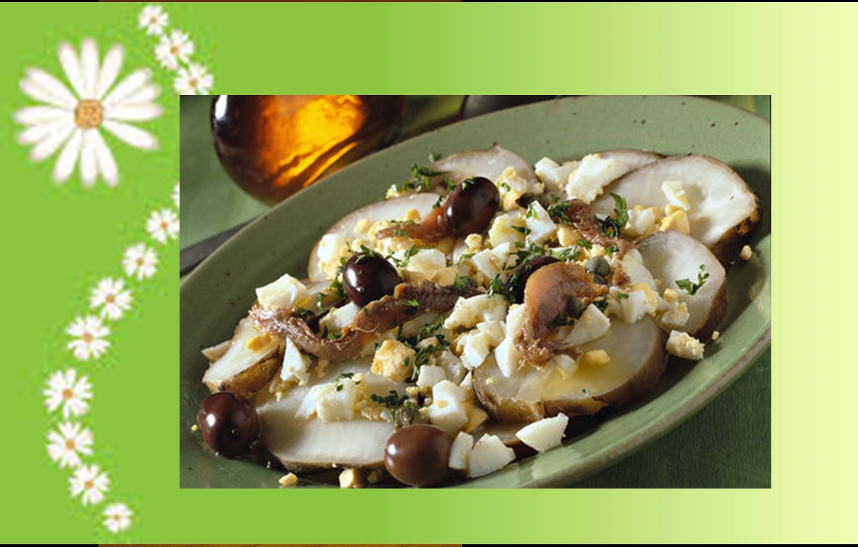 una forchetta. Scola anche i topinambour e affettali. Mettili in quattro piatti e cospargili con il trito di uova.