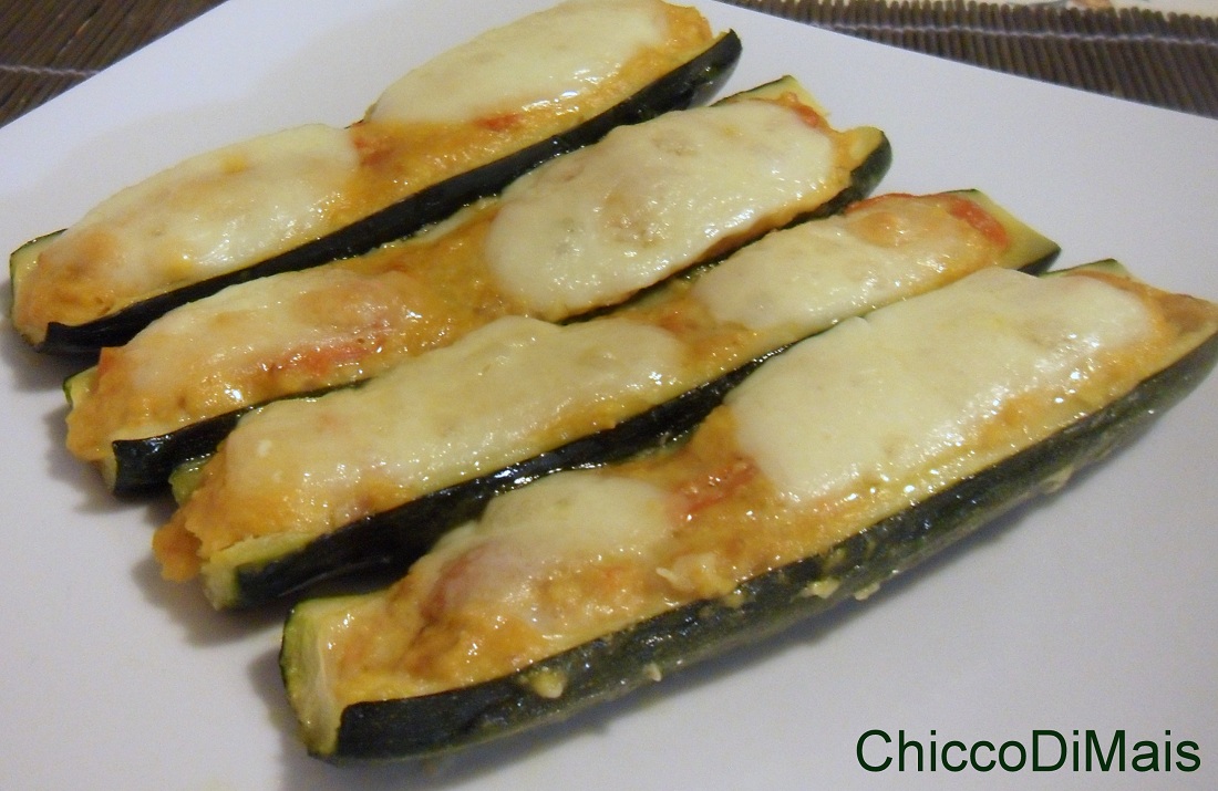 In una padella faccio soffriggere a fuoco basso la cipolla finemente tritata in 3 cucchiai di olio e aggiungo la polpa delle zucchine tagliata a pezzi. Nel frattempo in una terrina mescolo il pangrattato, il formaggio, la mozzarella a pezzi,il sale e il pepe e mescolo. Vi aggiungo il soffritto e riempio le zucchine (la mozzarella deve stare all'interno altrimenti si brucia).
