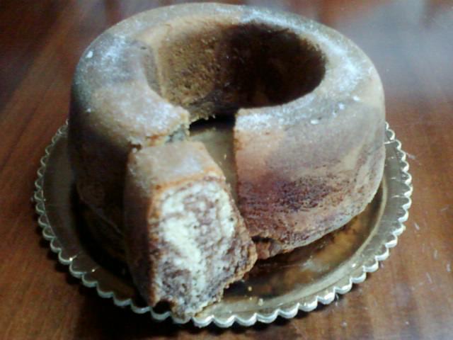 Sbattere il burro con lo zucchero, aggiungere le uova, poi la farina e 100 gr di fecola, il lievito e la vanillina, tutti setacciati. Dividere l'impasto in due parti uguali, su uno mettere la restante fecola e sull'altro il cacao , devono essere della stessa densità e se cosi non fosse su quello più denso aggiungere del latte. Versare un paio di cucchiai del composto bianco su una teglia imburrata ed infarinata, di seguito sopra, sempre al centro, versare due cucchiai del composto alternando, fino a terminare l'impasto e cuocere a 180° C per circa 50/60 minuti.