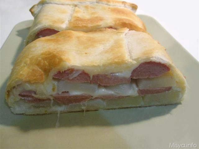 Stendere il rotolo di pasta sfoglia, disporre le patate, la mozzarella e i wurstel. Chiudere il rotolo e infornare per 20-30 minuti