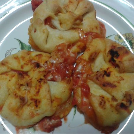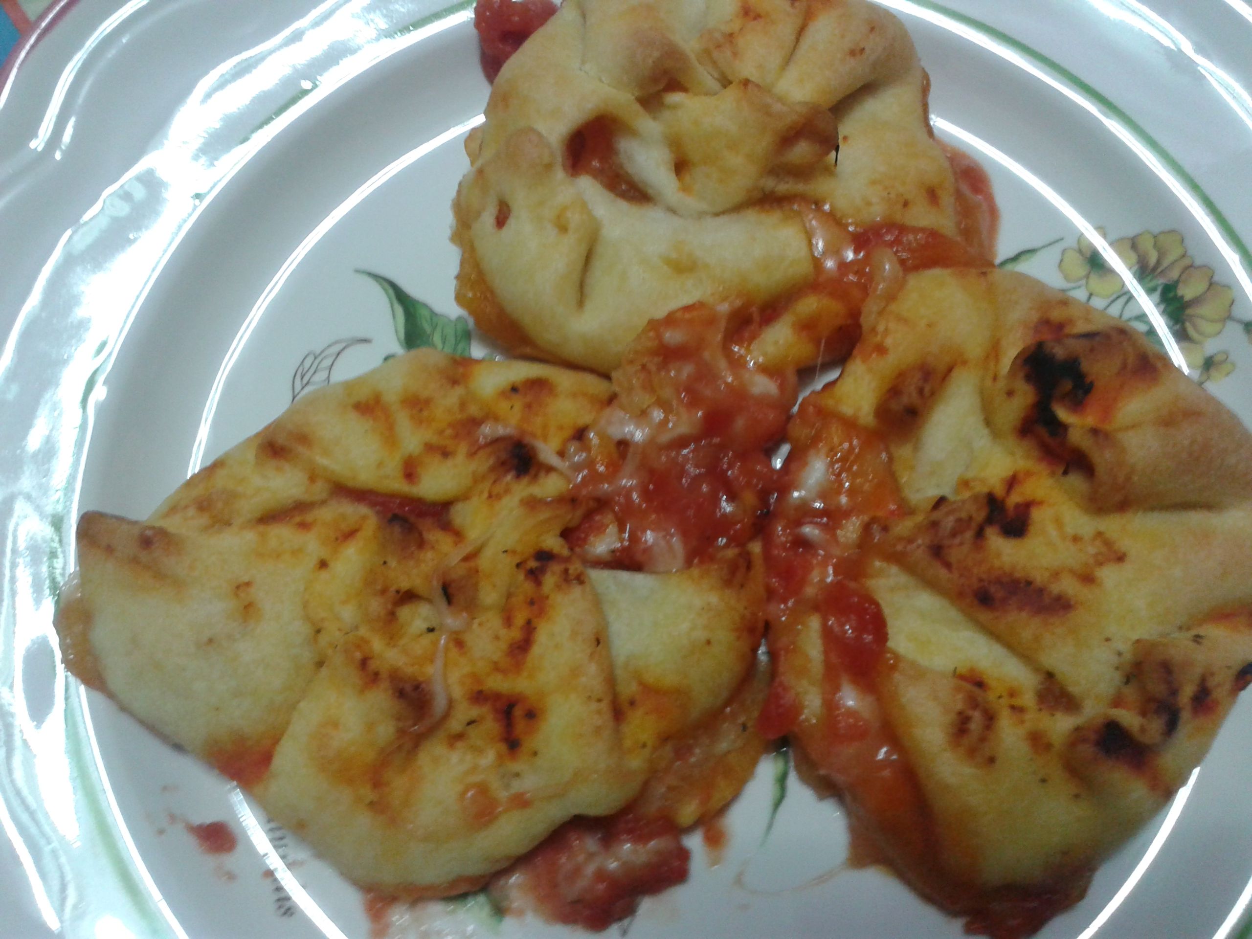 Mettere su ognuo dei triangoli la polpa di pomodoro, la mozzarella tagliata a cubettii, il sale, l'origano e l'olio.