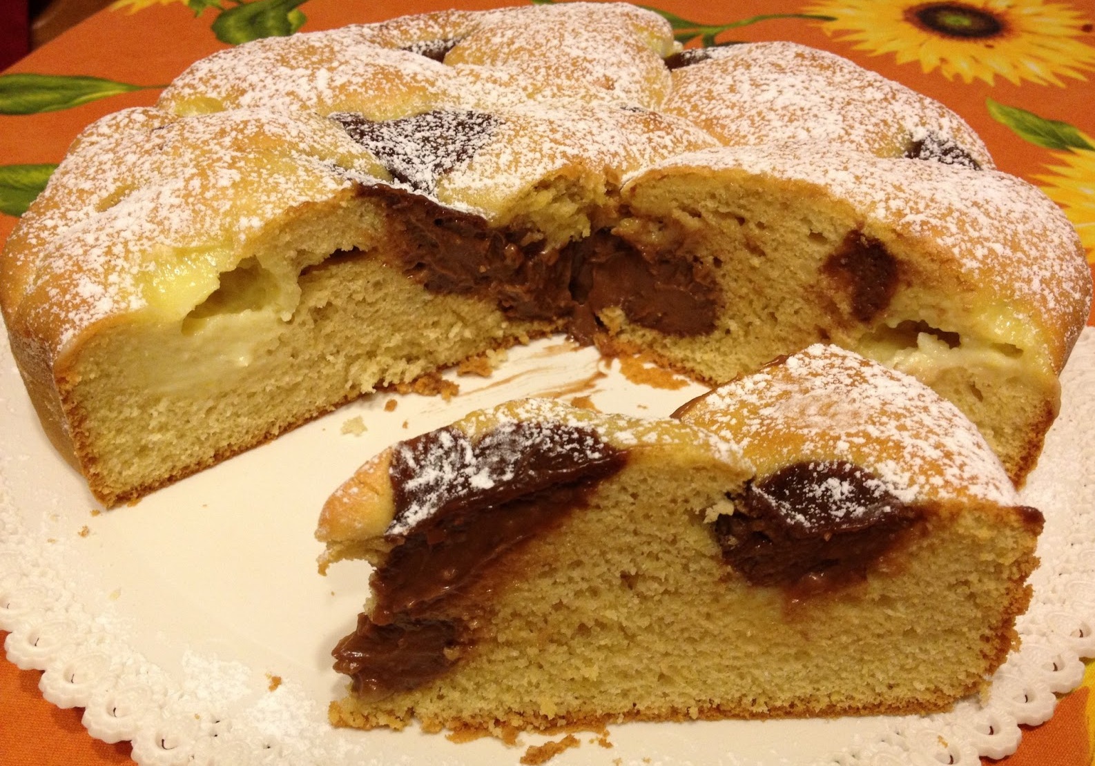 Preparare la crema pasticcera: sbattere l'uovo con lo zucchero, unire la maizena, la vanillina ed amalgamare bene. Versare il latte ed immergere la scorza di limone intera tagliata con il coltello. Porre sul fuoco e cuocere. Sciogliere a bagnomaria i 2 cioccolati insieme. Dividere la crema preparata precedentemente in 2 parti uguali ed in una versare i cioccolati fusi e mescolare. Ora preparare la base: montare le uova con lo zucchero, unire la vanillina, la scorza grattugiata di limone, l'olio ed amalgamare bene con le fruste. Versare il latte, mescolare ed infine aggiungere la farina ed il lievito e mescolare bene. Imburrare ed infarinare una tortiera e versare il composto della base. A questo punto mettere a cucchiaiate su tutta la superficie la crema pasticcera alternata a quella al cioccolato. Infornare a 180 gradi per 40-45 minuti. Lasciar raffreddare e sformare.