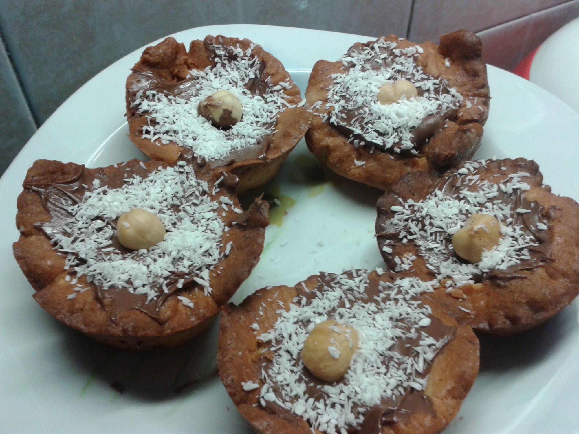 Lasciarli raffreddare e riempirli di nutella, decorando con le nocciole e se si desidera con una spolverata di cocco.