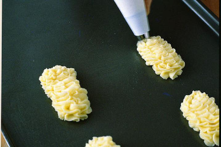 Prepara il pure con il doppio del burro, lascialo intiepidire e incorpora 3 tuorli; fallo scendere a grossi ciuffi da una tasca con bocchetta larga a stella su una piastra e inforna a 200° per 15 minuti.