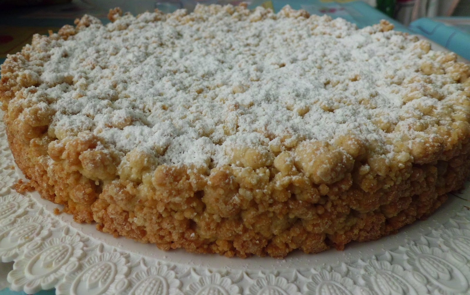 Imburrate una tortiera, spolverizzatela con un po’ di farina gialla, disponetevi il composto sbriciolato livellandolo con delicatezza a un’altezza di circa tre centimetri e cuocete in forno caldo a180° per quaranta minuti. Ritirate, lasciate raffreddare nel recipiente di cottura e poi trasferite il dolce sul piatto da portata e spolverare di zucchero vanigliato.