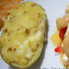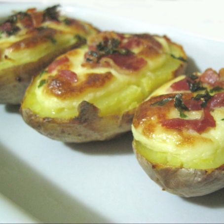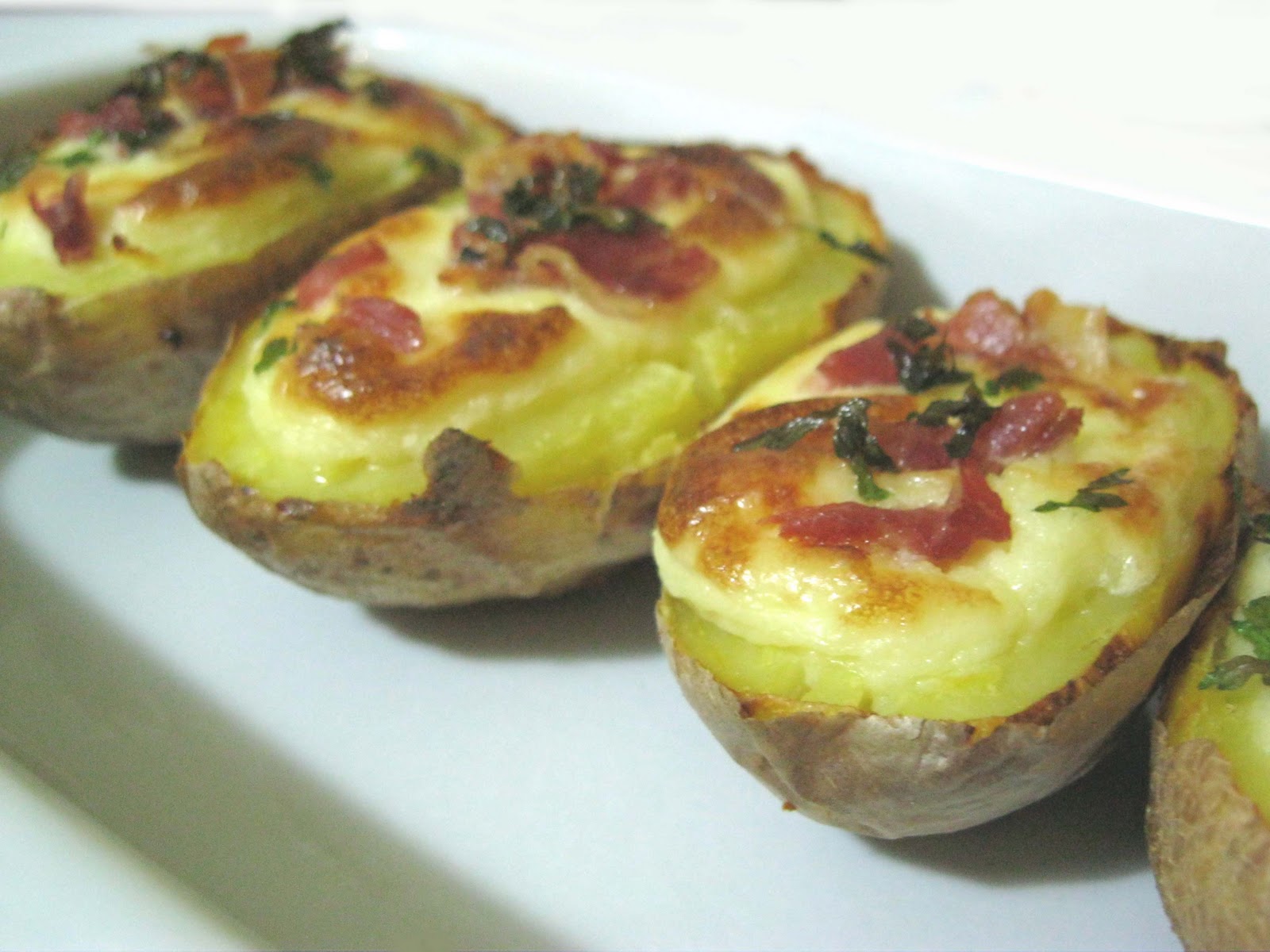 Bollire 8 patate con integre con la buccia. La cottura si ritiene ultimata quando le patate sono "semidure" (non devono spappolarsi!). Una volta scolate, prendere una patata, tagliarla in due e scavare ambedue le parti. L'interno delle patate andrà riposto in una ciotola all'interno della quale mischiare anche panna da cucina, prosciutto cotto, provola, prezzemolo, pepe nero e sale q.b. Impastare il composto e riempire le due parti della patata prima tagliate. Ripetere il procedimento per le restanti sette patate e cuocere in forno con l'aggiunta di un tocco di burro e di pan grattato sulla superficie superiore. Tenere in forno a 180 gradi per circa 20 minuti.