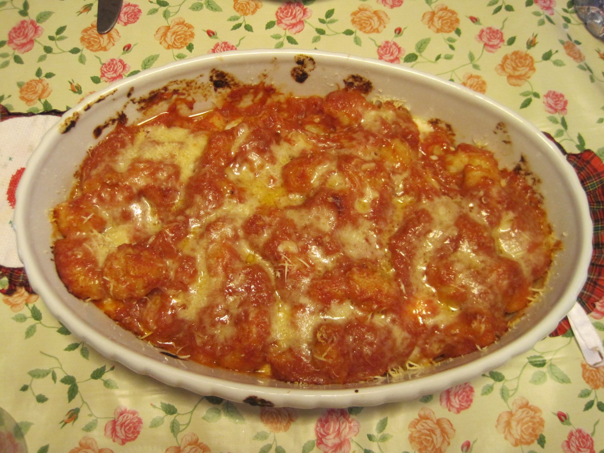 Dividerli a metà e mettere la prima metà in una pirofila da forno. Aggiungere su di essi la provola, la seconda metà degli gnocchi e infine il parmigiano.