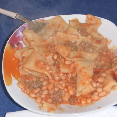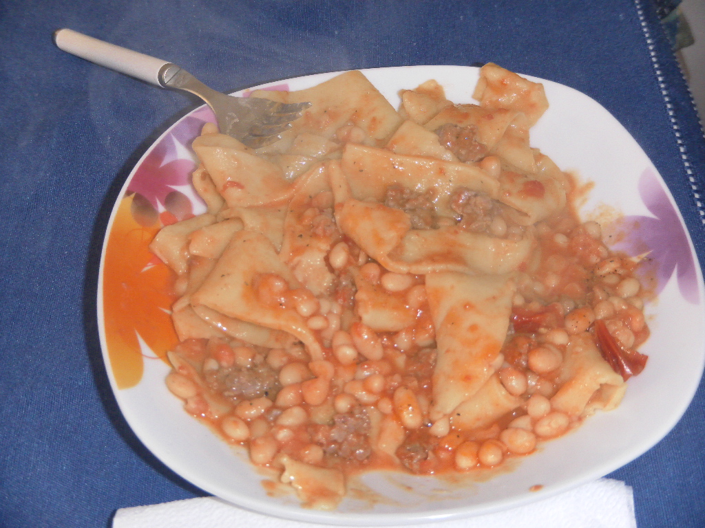 Condire con un sugo di fagioli, salsiccia sbriciolata, cipolla, olio e passata di pomodoro.