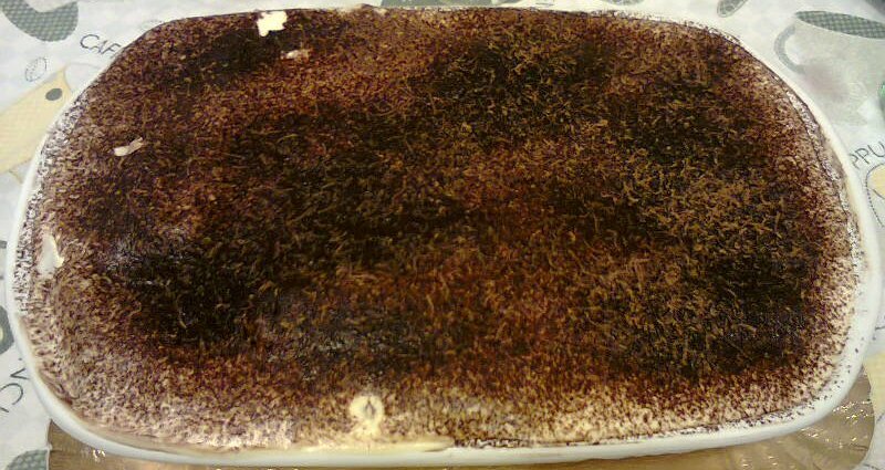 Unire al caffè l'acqua ed il latte,iniziare a formare uno strato di savoiardi inzuppandoli uno ad uno nella bagna al caffè,ricoprire con uno strato di crema al mascarpone e livellare bene la superficie.Continuare con un altro strato di savoiardi inzuppati e crema,completando il tutto con una spolverizzata di cacao amaro. Conservare in frigo, coperto con dell'alluminio, per almeno due ore.