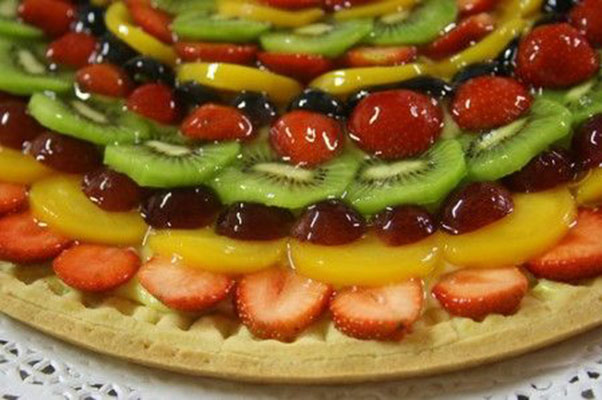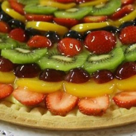 Tagli la torta a metà orizzontalmente, spalmi la parte inferiore di crema pasticcera, poi disponga la metà della frutta sgocciolata.