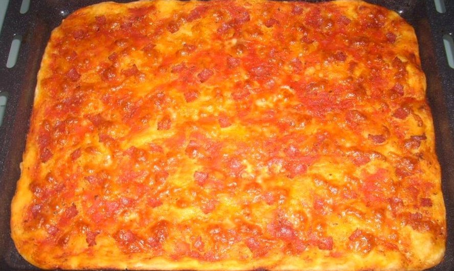 Disporre la farina setacciata a fontana con il sale, aggiungere al centro il lievito sciolto in acqua tiepida,lavorare velocemente fino a ottenere una pasta morbida, lavorandola, tirandola ed allungandola finchè non diventa elastica. Formare una pagnottina, incidere una croce sopra, porla in una ciotola coperta e farla lievitare in luogo tiepido per 3 ore. Quando è raddoppiata di volume, appiattirla con le mani e tirarla a disco, di circa mezzo cm, con il matterello. Sistemarla in una teglia unta d'olio o foderata con carta da forno e premere fino a coprire il fondo, ma lasciando i bordi più spessi. Aggiungere gli ingredienti a piacere lasciando liberi due centimetri di pasta del bordo e cuocere in forno caldo a 250 gradi per 20 minuti.