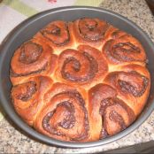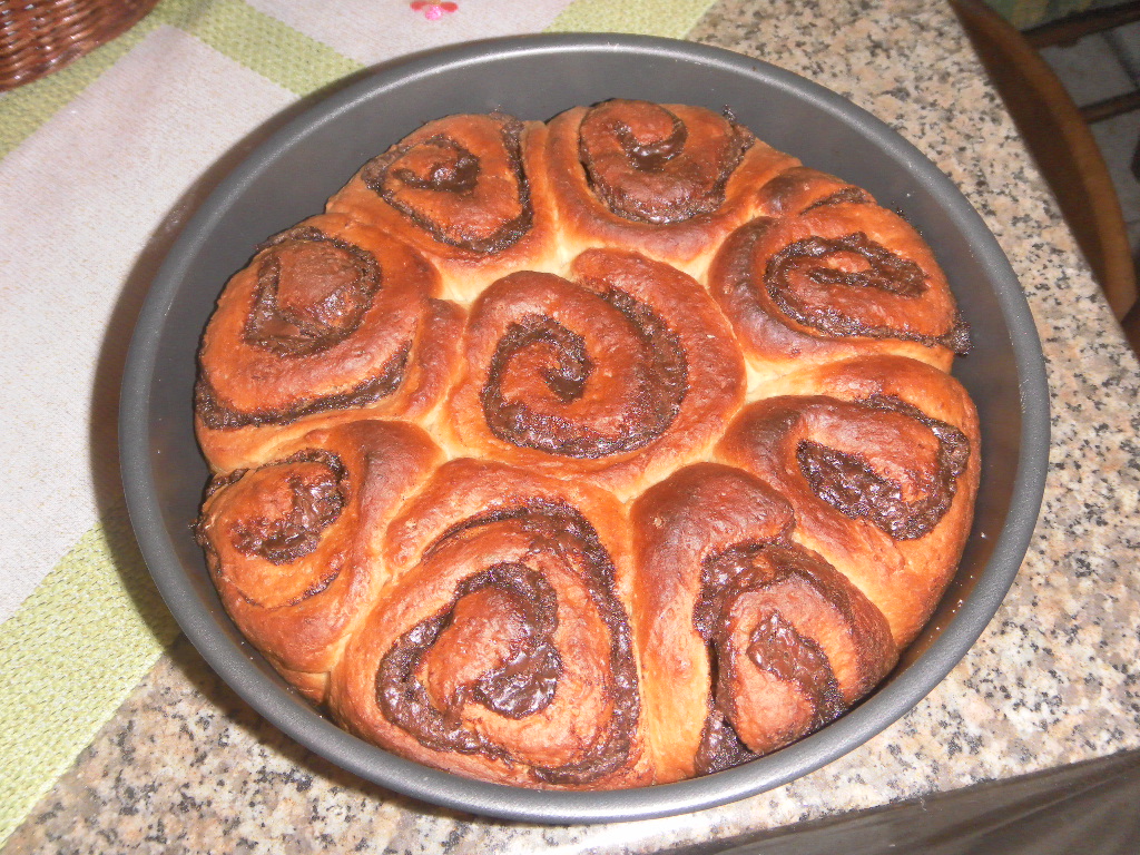 Tagliare il rotolo a fette spesse. Disporre la prima fetta al centro di una tortiera imburrata e zuccherata e le altre intorno a cerchio distanziandole un pò.