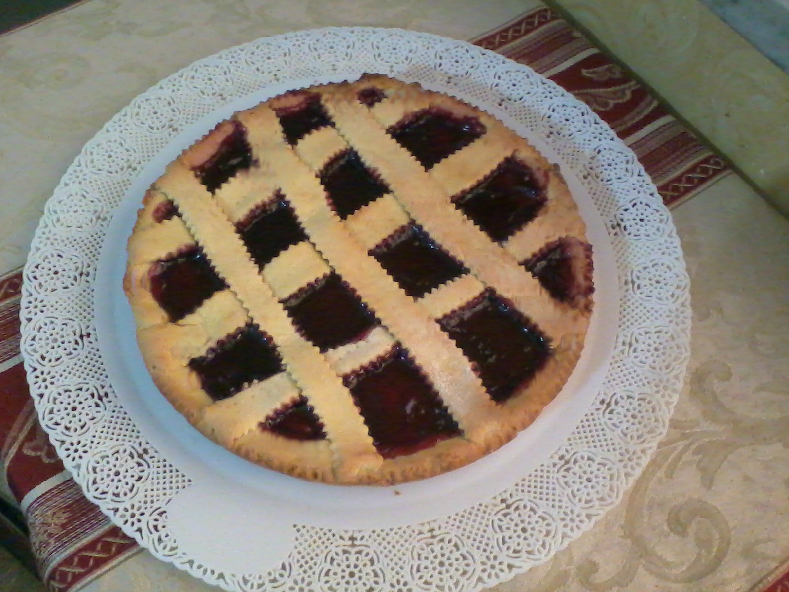 Stendere la frolla alta 3 mm, bucherellare il fondo, riempire con crema; ricavare delle striscioline di frolla e adagiarle sopra la crostata.
