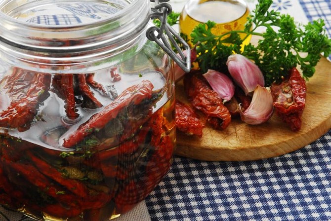 Cominciare quindi a riempire i vasetti di vetro, ben puliti e asciutti, con i pomodori secchi. Man mano che i vasi vengono riempiti coprire con l'olio, rigorosamente d'oliva extra-vergine e con i capperi, spicchi d'aglio, peperoncino e origano.