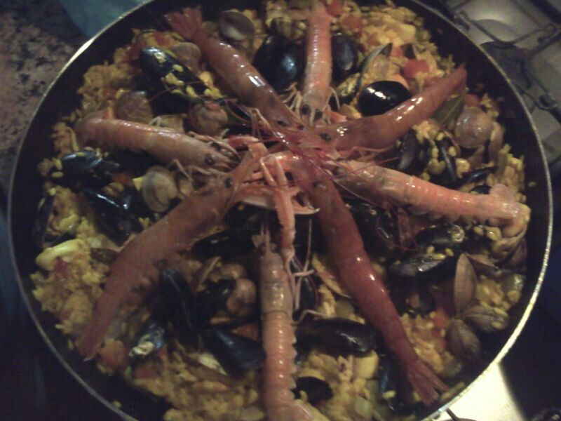 quando il riso è cotto tolgo dal fuoco decoro con gli scampi (passati sul fuoco con un po’ d’olio su una padella), le cozze e copro con un canovaccio per lasciare riposare 10-15 minuti prima di servire.