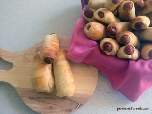 Mettiamo i wurstel distanziati su una teglia sulla quale abbiamo messo carta da forno, lasciamoli lievitare di nuovo per un’oretta, spennelliamo poi di uovo e panna in pari quantità e inforniamo a 180° fino a doratura.