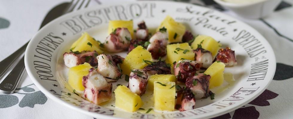 Servite il polpo e le patate conditi con un filo di olio extravergine di oliva.