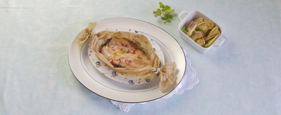 Servite la trota nel suo cartoccio accanto ai carciofi.