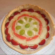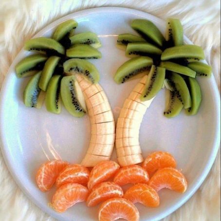 Tagliare a fette i kiwi e la banana (circa 10 pezzi per frutto) e disporli su un piatto formando delle palme come nella foto.