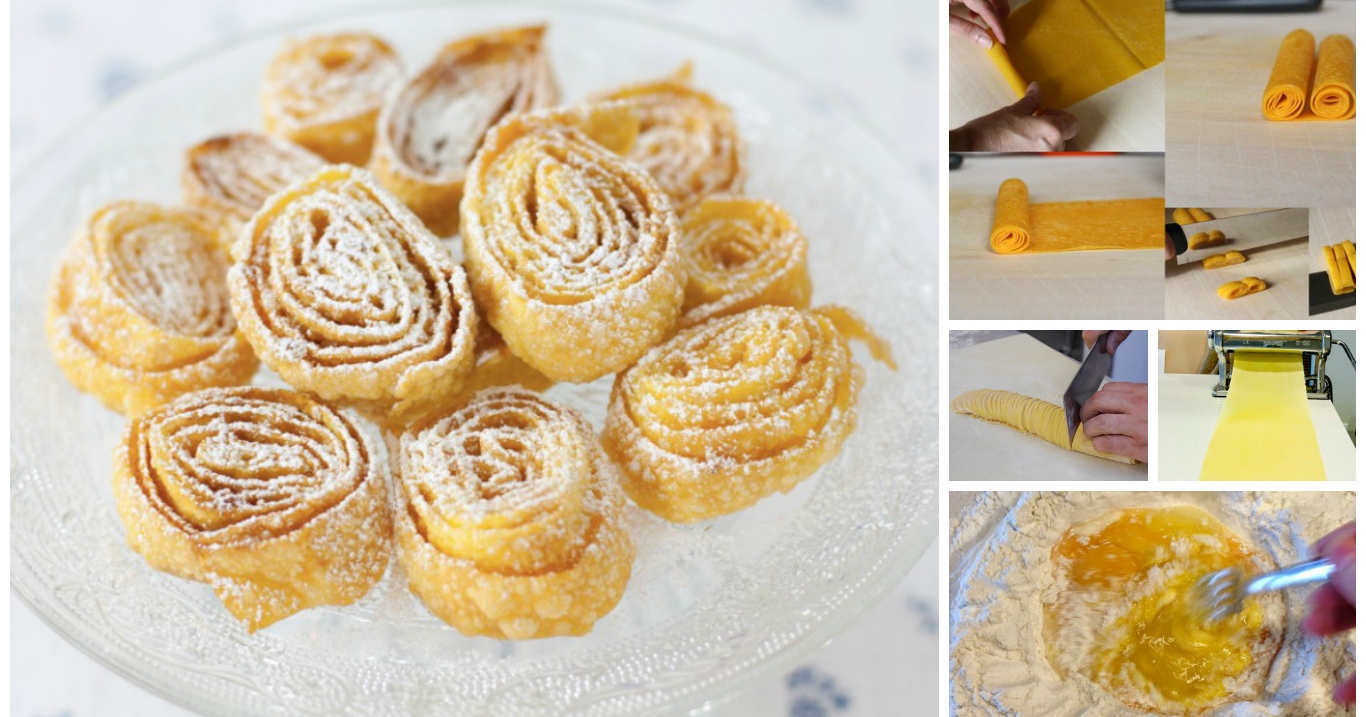 Arrotolare la sfoglia e lasciarla riposare per circa mezz'ora in un luogo fresco. Tagliare a fettine spesse circa 1 cm e friggerle in padella con abbondante olio di semi ben caldo. Toglierle dal fuoco quando saranno dorate, scolarle e spolverare con abbondante zucchero a velo.