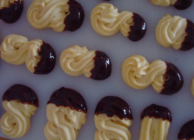 Farli raffreddare. Sciogliere a bagno maria il cioccolate e quando sarà ben fusa immergerci la punta dei biscotti.