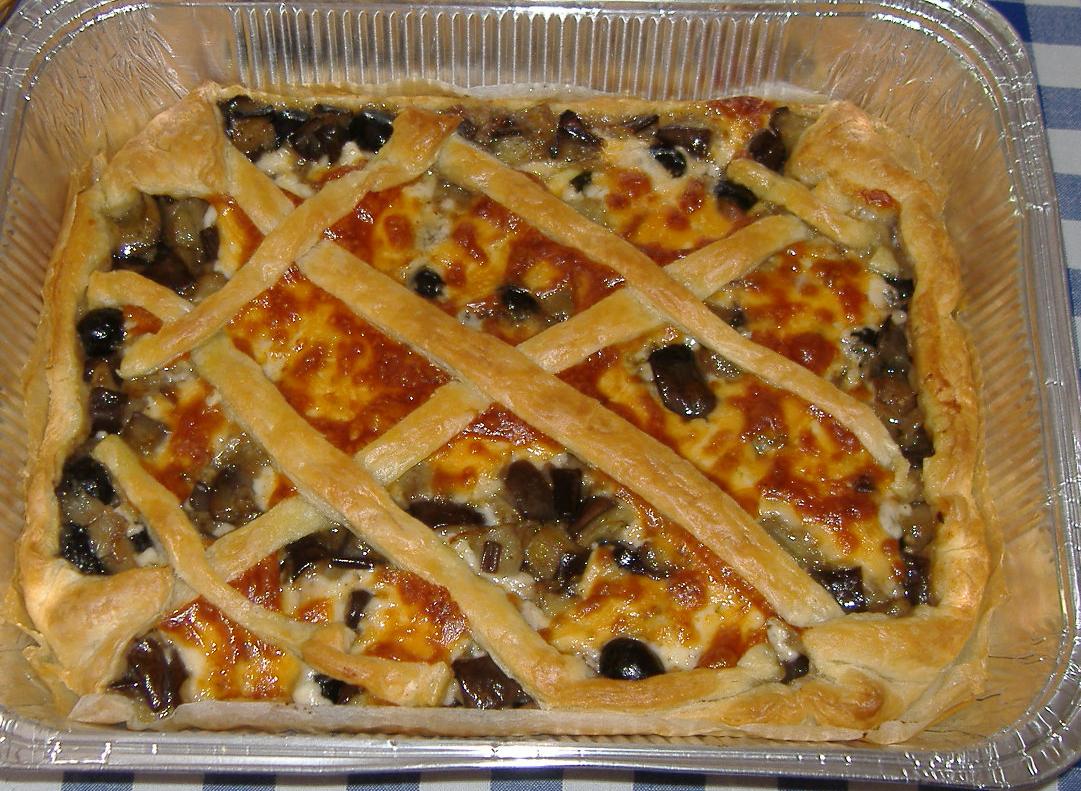 Foderate la teglia con un rotolo di pasta sfoglia e riempitela poi di prosciutto, il formaggio e le melanzane.