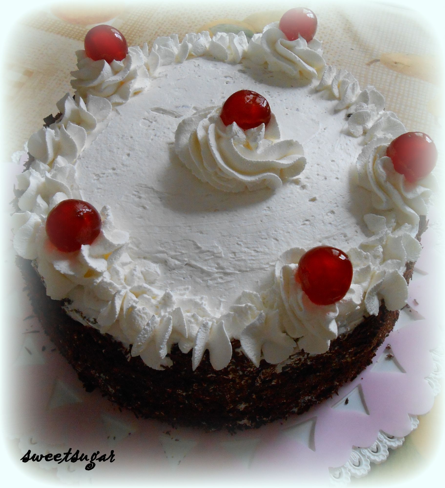 Per prima cosa prepariamo la base, che dovrà raffreddarsi prima di essere farcita. Montiamo le uova con lo zucchero per almeno 5 minuti, incorporiamo poi le farine setacciate ed infine il burro fuso!Inforniamo a 180° per 30-40 minuti circa. Mentre aspettiamo che la nostra base si cuocia in forno, montiamo molto bene la panna: se usate quella fresca zuccherate prima di montare con lo zucchero a velo!Procediamo poi a preparare la nostra bagna: allunghiamo il succo delle amarene con 100ml di acqua e pochissimo rhum o, in alternativa, del maraschino! Una volta che la nostra base è ben fredda tagliamola in 3 strati: inumidiamo la base con la bagna e farciamo con abbondante panna e le amarene sgocciolate; procediamo così anche con l'altro strato, ricordandoci sempre di bagnare il pan di spagna. Una volta pronto ricopriamo tutta la torta, lati compresi, con la restante panna. Per preparare la decorazione della torta basta ricavare dei riccioli di cioccolato fondente ( sembrano piccoli trucioli di legno :)) utilizzando un pelapatate, e facciamoli aderire ai lati della nostra torta. Aiutandoci con la sach a poche formiamo delle decorazioni a piacere e completiamo la decorazione con i nostri canditi