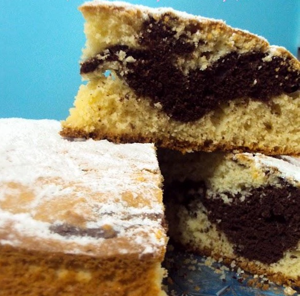 Montare i tuorli con lo zucchero, aggiungere il burro, la farina e infine gli albumi montati a neve. Aggiungere il cacao a metà impasto e mettere nella teglia un cucchiaio alla volta alternando. Infornare a 180° per un ora.