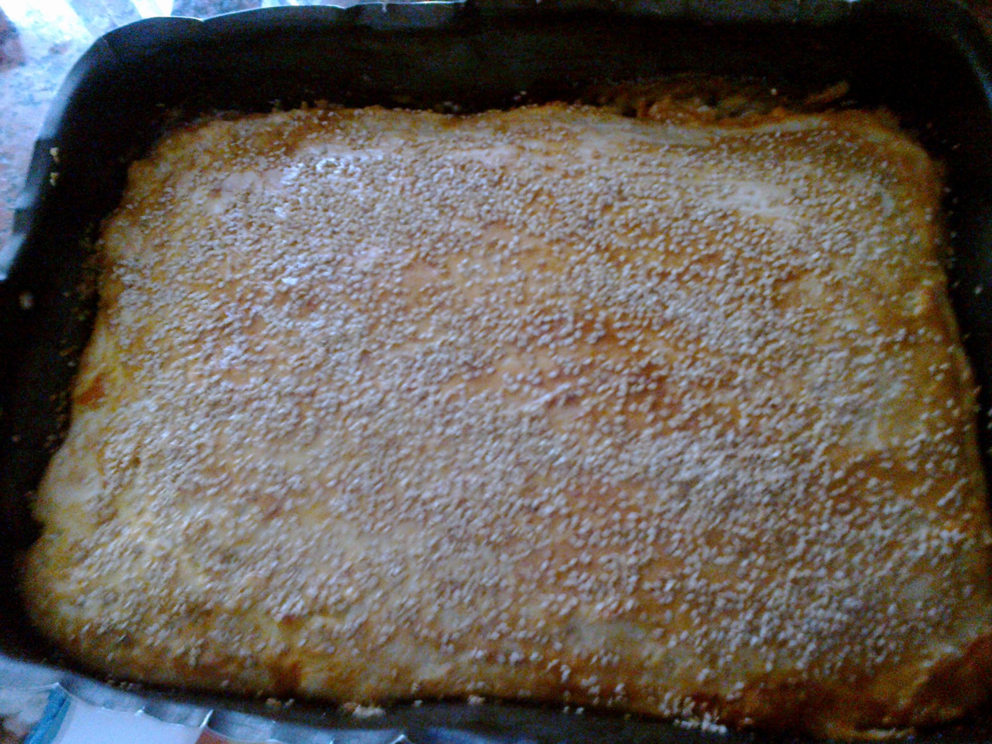 Lasciare lievitare per circa 2h. Dividere l’impasto in due e stendere la prima parte con il mattarello dando quanto più possibile la forma rettangolare. Posizionare il rettangolo di pasta in teglia rivestita di carta forno e lasciare lievitare per circa 10 minuti.