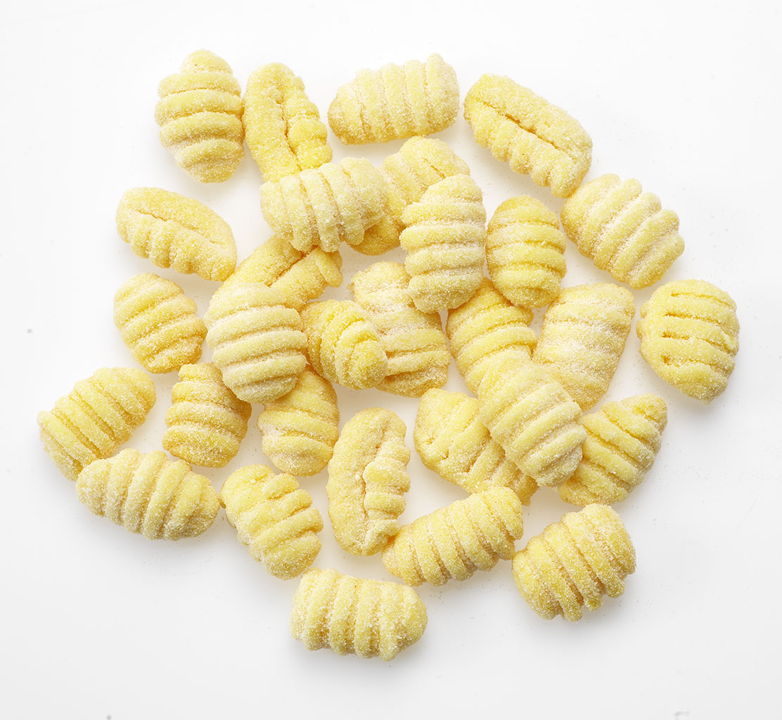 Lavare le patate e porle in una pentola di acqua fredda con del sale, portarla ad ebollizione e cuocere. Terminata la cottura scolarle, pelarle subito e passarle allo schiaccia-patate. Appena le patate si sono raffreddate unire tutti gli ingredienti formando un impasto unico. Preparare gli gnocchi formando dei cilindretti del diametro di 1,5cm circa, tagliandoli in lunghezza di 2cm circa e rigare gli gnocchi con l’aiuto di una forchetta o di un utensile di legno. Lessarli in abbondante acqua salata, e scolarli con molta delicatezza con un ragno dopo che saranno saliti in superficie, condirli e servirli ben caldi.