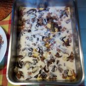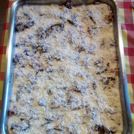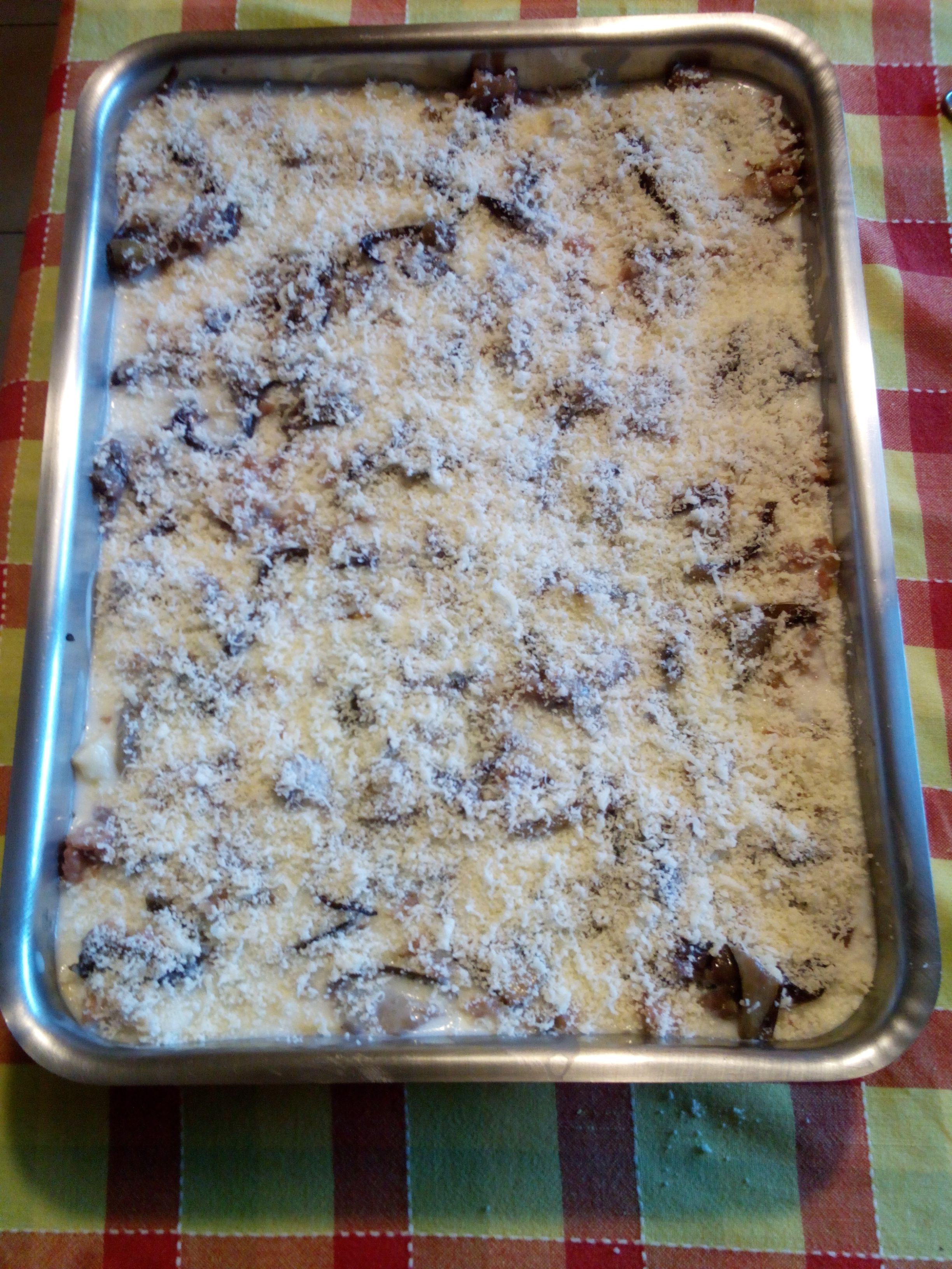 Procedere a strati con il primo strato di besciamella, radicchio e carne.