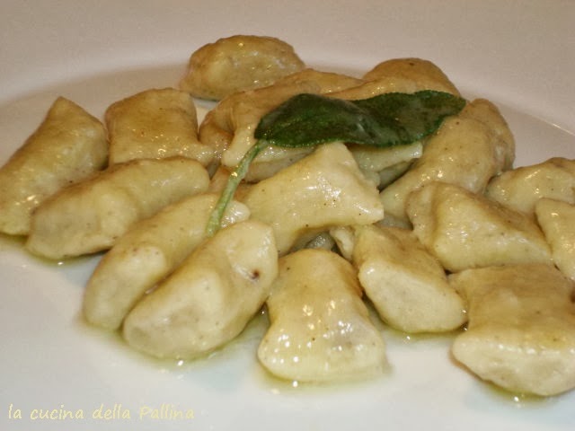 Mettere a bollire una pentola con dell’acqua salata, quando l'acqua bolle versare gli gnocchi e attendere che riaffiorino in superficie. Scolarli e metterli in una zuppiera, condire con burro fuso e salvia.