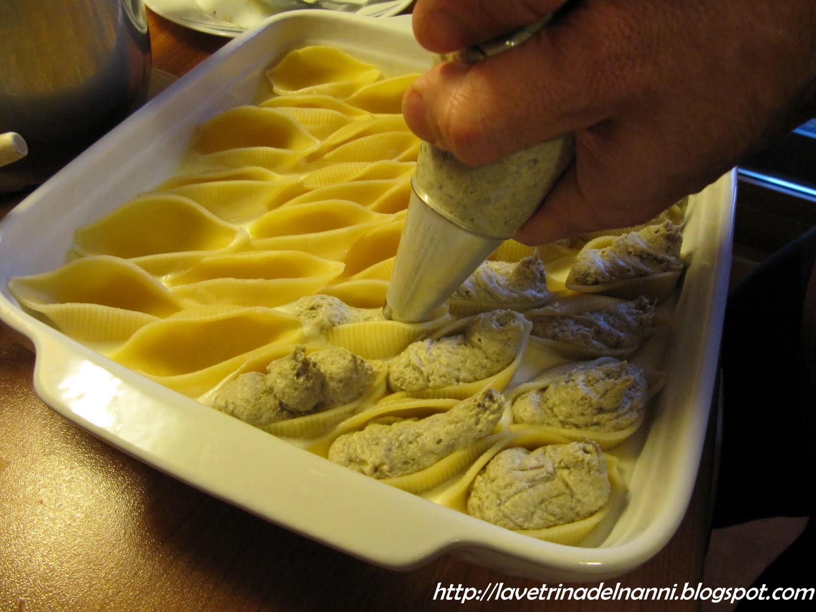 Farcire uno alla volta i conchiglioni con l' impasto preparato. Sistemarli in una pirofila che possa contenerli a misura e velare con la crema avanzata. Cospargerli con il grana grattugiato. Decorare con gli spicchi di carciofo tenuti da parte e passare in forno a 200 gradi per 15 -20 minuti.