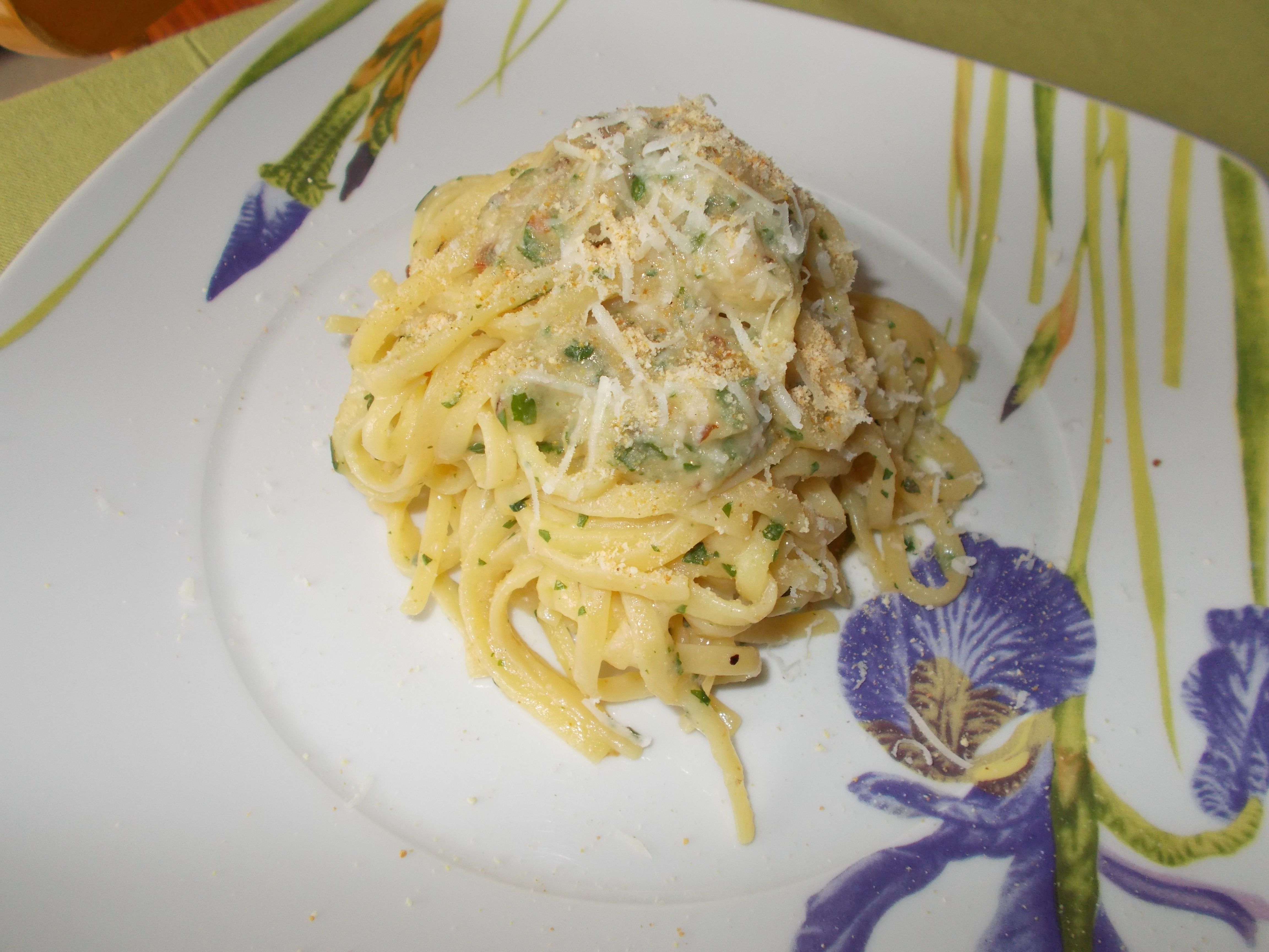 Ho scolato la pasta dopo pochi minuti di cottura direttamente nella padella, ho aggiunto il prezzemolo tritato ed ho fatto continuare la cottura.