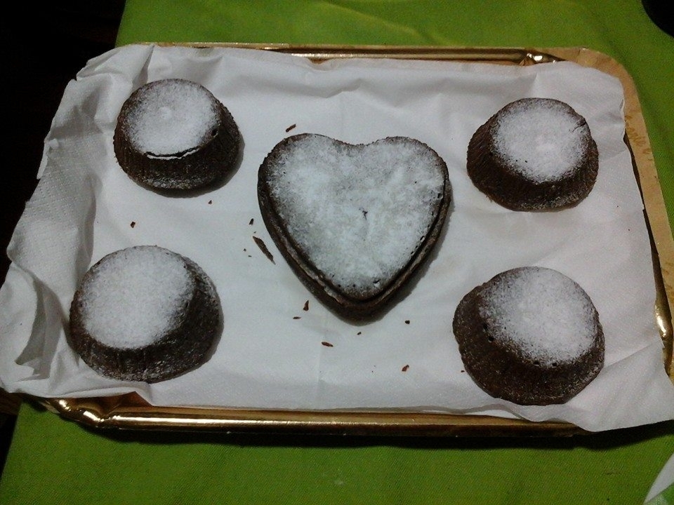 Infornare a 220° per 8-10 minuti circa, regolando i tempi di cottura a seconda della grandezza degli stampini ( se 4 più grandi 8-9 minuti, se sono 6 stampini 8 minuti potrebbero già essere troppi). Non cuocere troppo oppure il centro non resterà morbido e "scioglievole".