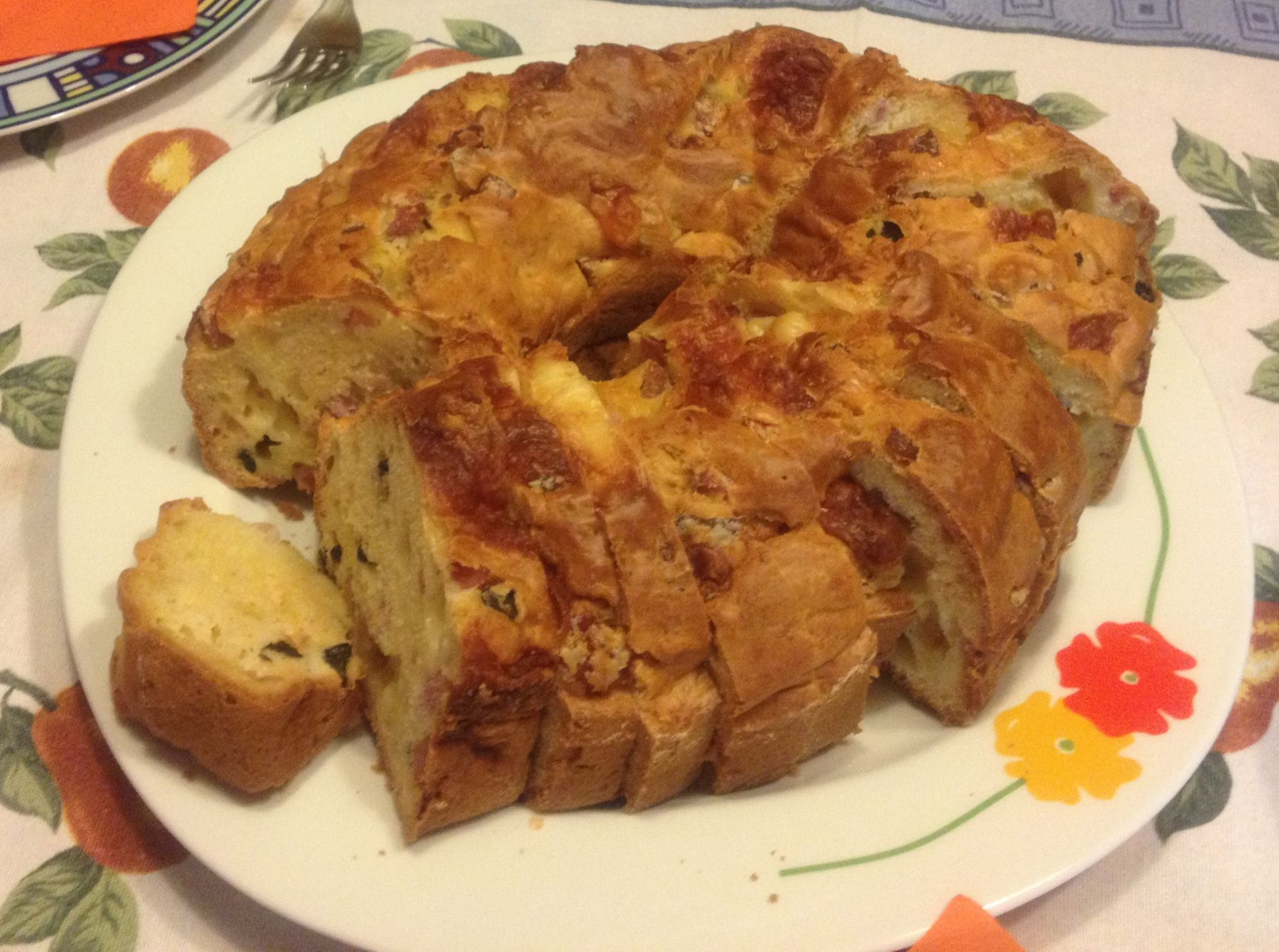 Quindi unite al composto il gruviera tagliato a cubetti, la pancetta a cubetti, le olive tagliate a pezzetti ed aggiustare di sale e pepe. Rovesciare il tutto nello stampo ed infornare per 35/40 minuti circa.