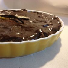 Nel frattempo tritate il cioccolato e scioglietelo a bagnomaria, aggiungendo 100 gr di burro; mescolate per sciogliere il tutto e lasciate intiepidire.
