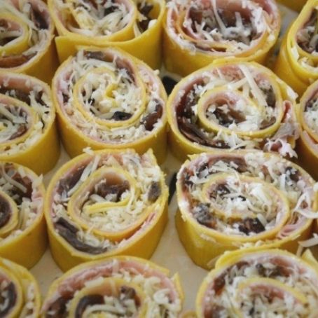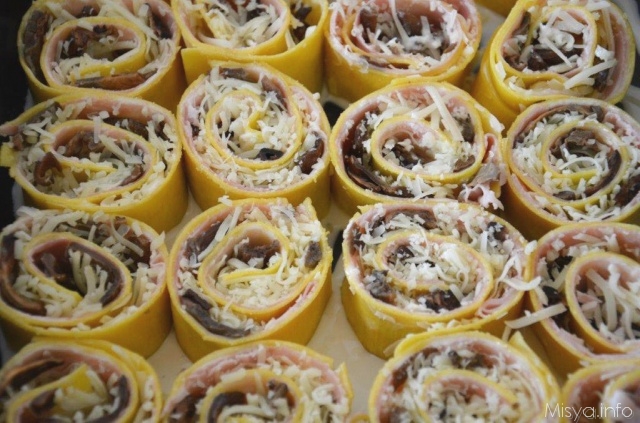 Ricoprire ogni foglio di pasta con prosciutto cotto e formaggio tenero. Arrotolare ogni sfoglia dal lato più corto e tagliare le roselline alte un dito.