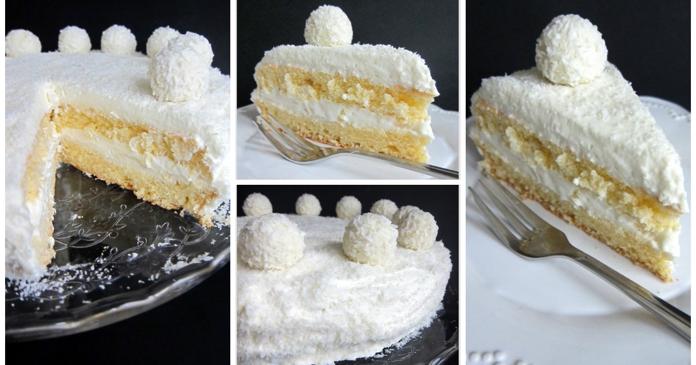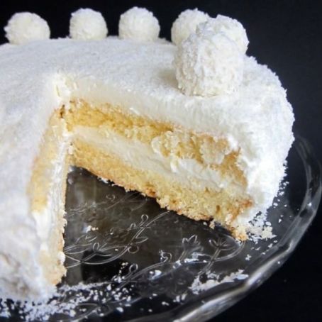 Ricoprire i bordi e la superficie della torta con la restante crema. Decorare la torta ricoprendola con la di farina di cocco e praline Raffaello, e riporla in frigo fino al momento di servirla.
