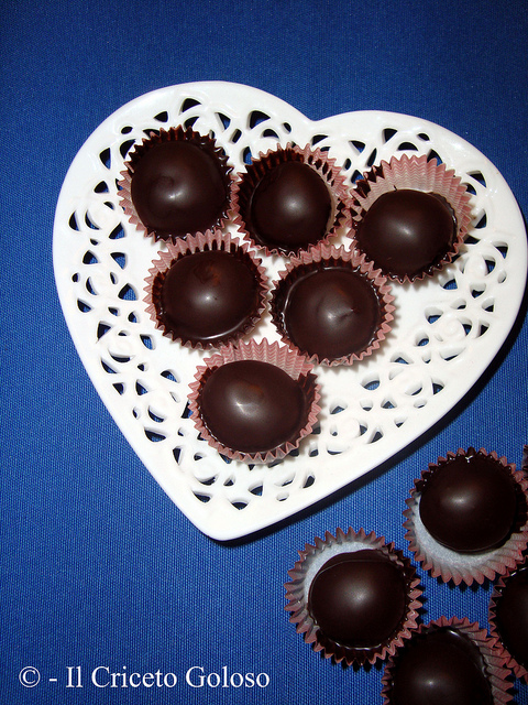 Formare delle palline e lasciarle a riposare per 20 minuti. A questo punto sciogliere il cioccolato fondente e glassare le palline ricoprendole di cioccolata. Fare asciugare la cioccolata e porre i bacetti in dei pirottini.