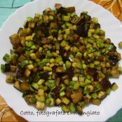 Tagliare a dadini piccoli le melanzane e le zucchine e farle rosolare in una padella antiaderente, per circa 5 minuti, spegnere le fiamma, salare e lasciar raffreddare. Tagliare a dadini anche la scamorza e i filetti di pomodoro sott'olio
