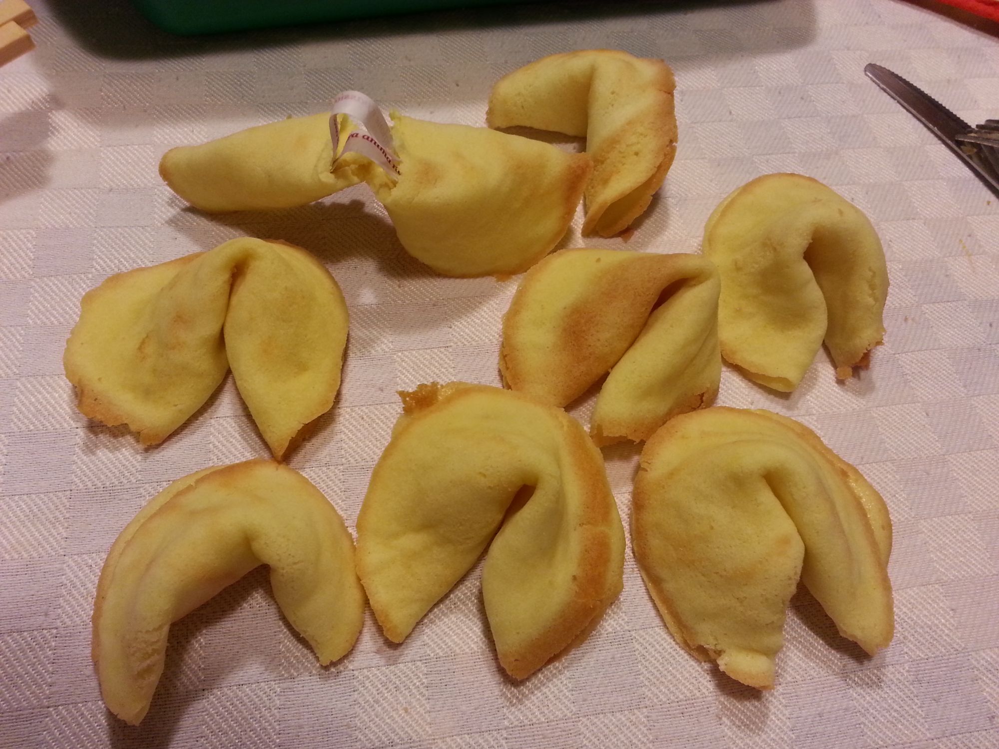 Estrarre la teglia da forno, adagiare i bigliettini sui dischetti di impasto e piegare il biscotto a metà fino a far toccare il bordo, quindi prendere un lembo e ripiegarlo dall'altra parte per dare la forma caratteristica.