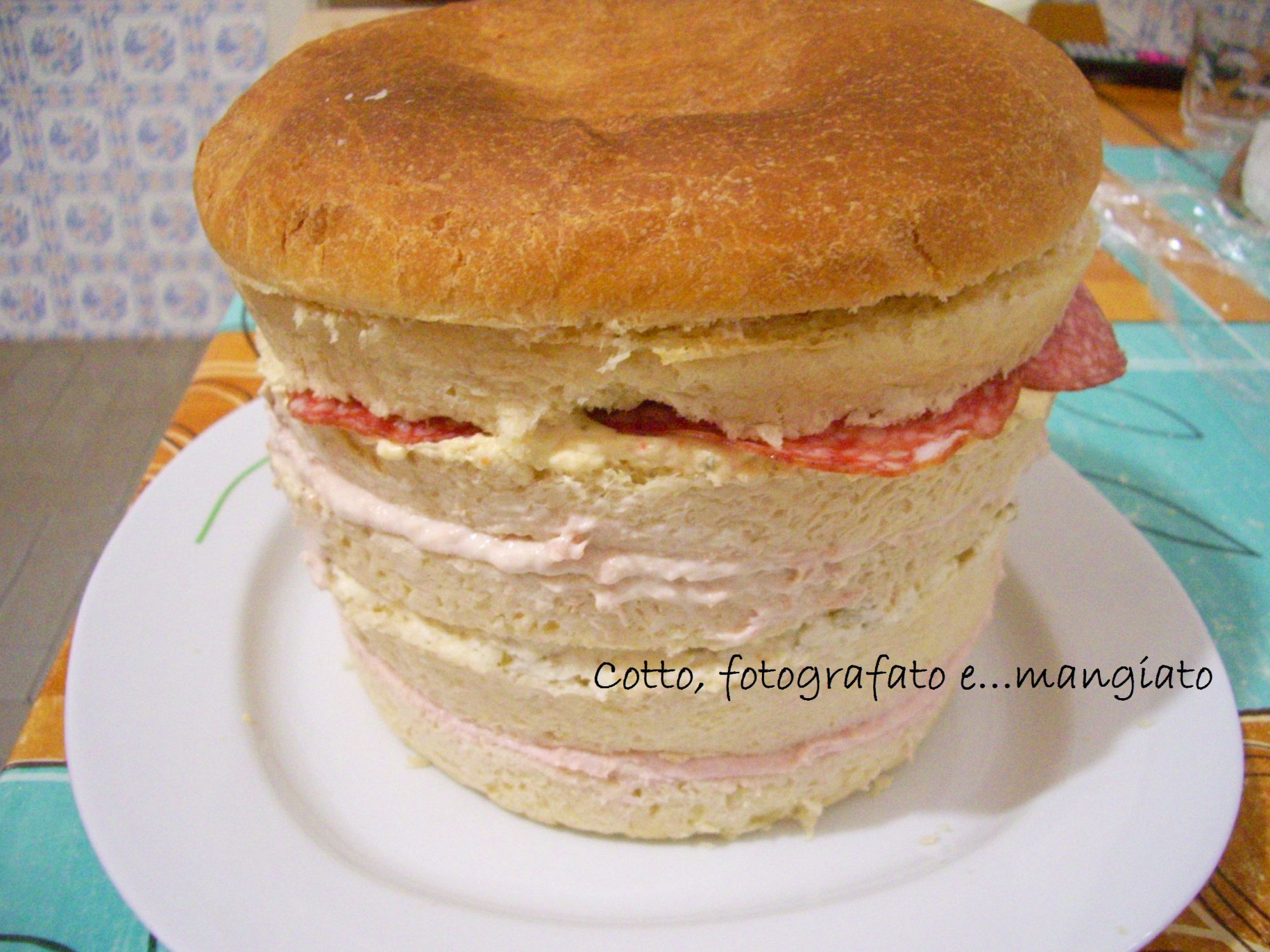A questo punto bisogna assemblare i vari strati io ho iniziato dalla mousse, ho proseguito con la crema di strachino e olive, poi la salsa tonnata la salsa capricciosa su cui ho messo il salame ed infine altra salsa tonnata che mi era rimasta ;) mi raccomando lasciate riposare per almeno 12 ore il panettone farcito, in questo modo sarà ancora più gustoso