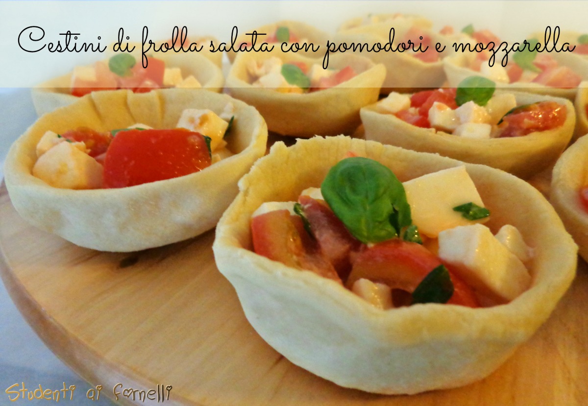 Capovolgete ora gli stampi e ungeteli leggermente con dell’olio di semi, poggiate il disco di pasta frolla e schiacciatelo in modo da evitare che si formi aria sotto (se avete delle formine per crostatine piuttosto piccole potete tranquillamente usarle per formare i cestini). Cuoceteli a 180° per circa 20 minuti fino a che non risultano dorati. Lasciateli raffreddare e nel frattempo lavate e tagliate i pomodori e la mozzarella a dadini. Conditela con olio di oliva, sale e basilico fresco tritato. Quando i cestini saranno ben freddi versate in ognuno l’insalata di pomodori e mozzarella.